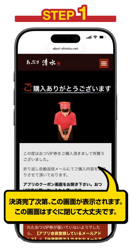 決済時の注意事項:決済時にご登録頂く電話番号とメールアドレスは、あぶり清水アプリに登録したものと同一にして下さい!
