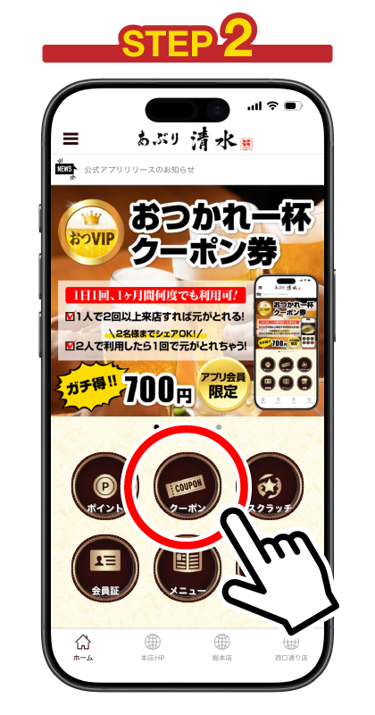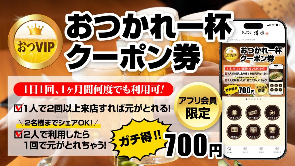 早速、あぶり清水グループアプリ&アプリ会員限定のおつVIP券についてご説明させて頂きます。