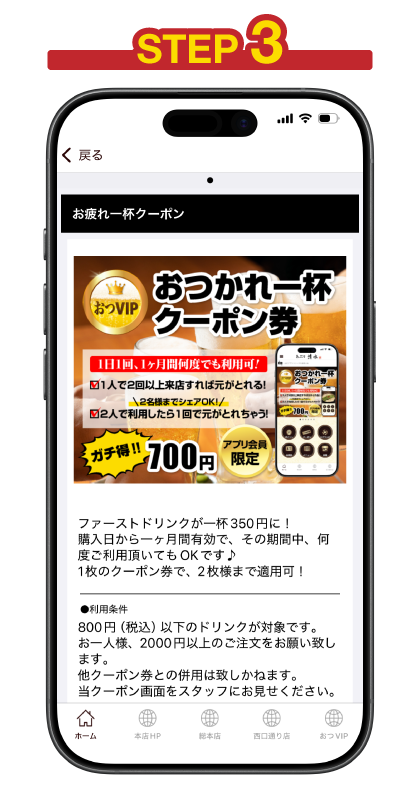 ご購入いただいたおつVIP券は、決済後に「アプリクーポン券」として反映されます(決裁完了からクーポン発行まで最大1分程度。電波状況等、お客様の環境により異なります)。